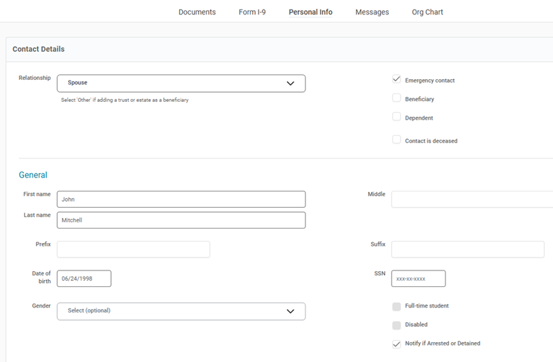 A “Notify if Arrested or Detained” checkbox now available on emergency contact screens to help employers meet California SB 294 (Workplace Know Your Rights Act) ahead of the March 30, 2026, deadline. Admins can record preferences via Employee Contacts, the Client New Hire Wizard (Core Onboarding), and other admin contact screens. Employees can self-manage through Emergency Contacts (ESS), AEE Onboarding, and AEE Self Service. Checking the box auto‑marks the contact as an emergency contact if needed while unchecking Emergency contact will clear the arrest/detention notification. Preferences are saved to the employee record for compliance tracking and employer notification duties. This option is available to all clients (not just California) to support future multi‑state compliance.